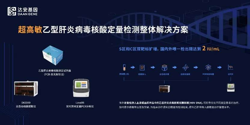 本次展會(huì),達(dá)安基因也首次展出超高敏乙型肝炎病毒核酸定量檢測(cè)整體解決方案,國(guó)內(nèi)外唯一檢出限達(dá)2 IU/mL,能讓乙肝診療變得如此精確!