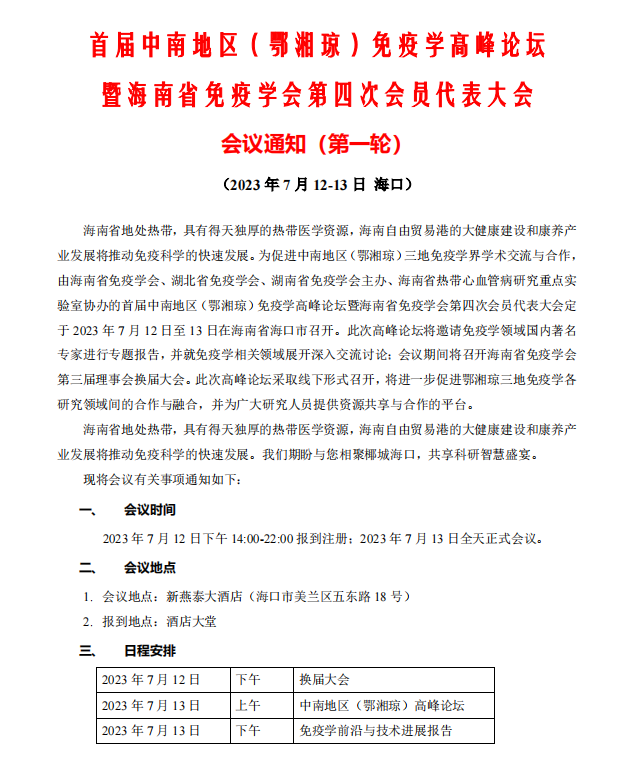 | 首屆中南地區(qū)(鄂湘瓊)免疫學(xué)高峰論壇??暨海南省免疫學(xué)會第四次會員代表大會 |