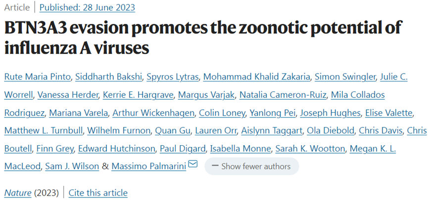1. Rute Maria Pinto et al. BTN3A3 evasion promotes the zoonotic potential of influenza A viruses. Nature, 2023, doi:10.1038/s41586-023-06261-8.