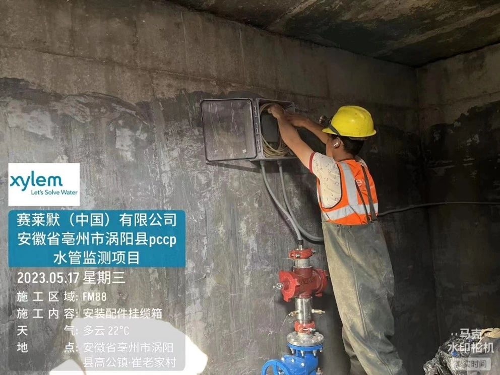 2023年6月30日,賽萊默完成了“ 安徽省渦陽(yáng)縣地表自來(lái)水廠一期工程輸水管線PCCP斷絲監(jiān)測(cè)項(xiàng)目”全部71.5km光纜鋪設(shè),2套斷絲監(jiān)測(cè)系統(tǒng)也已交付。待管道渠首泵站建成后,完成系統(tǒng)安裝調(diào)試后即可投入運(yùn)行。