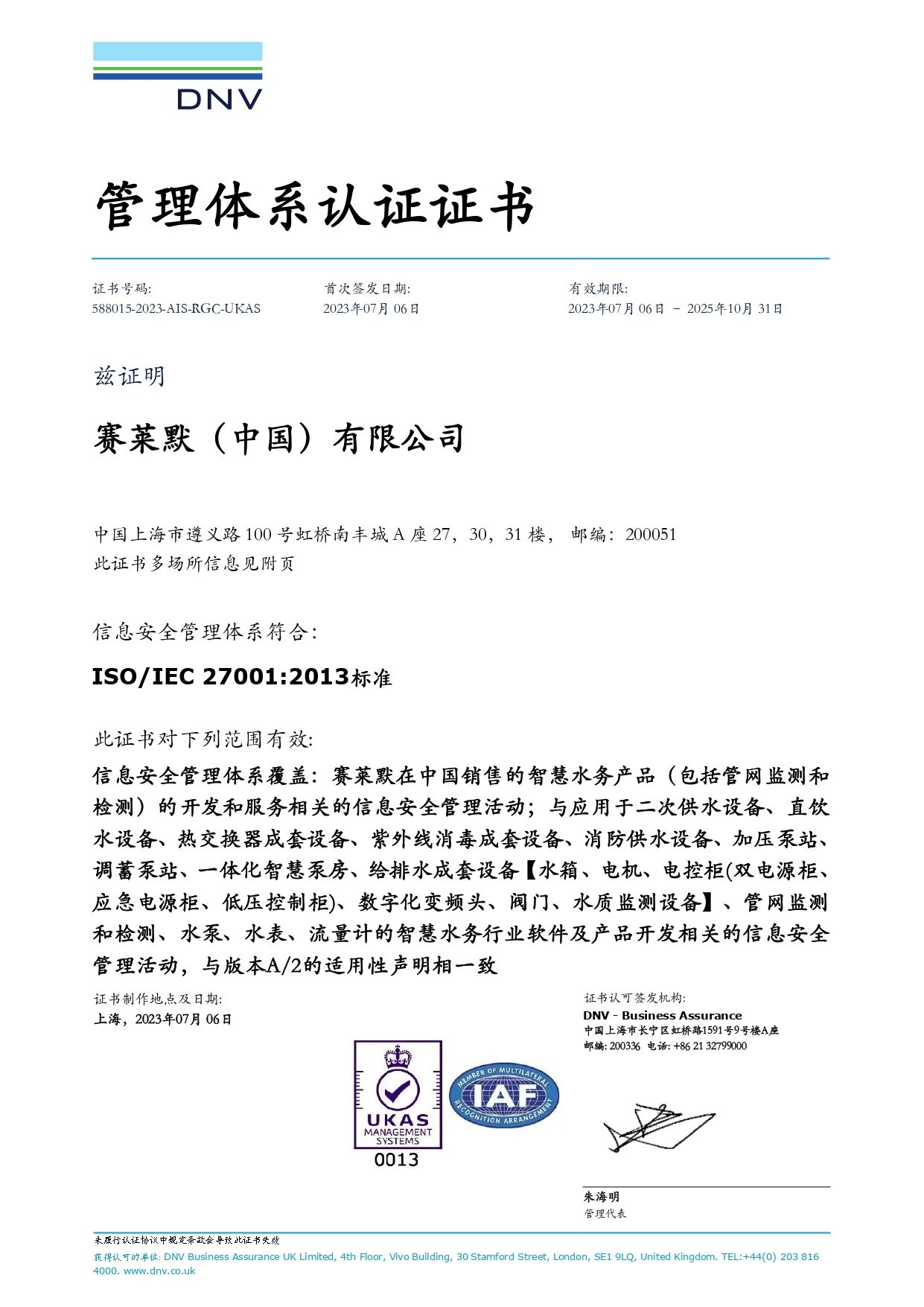 賽萊默中國(guó)本地?fù)碛袑B毜膱F(tuán)隊(duì)負(fù)責(zé)網(wǎng)絡(luò)安全和數(shù)據(jù)(包括隱私)安全,確保所有數(shù)據(jù)的收集、傳輸、處理及存儲(chǔ)滿足國(guó)家網(wǎng)絡(luò)和數(shù)據(jù)安全相關(guān)法律法規(guī)方面的要求。賽萊默“AFO斷絲安全預(yù)警系統(tǒng)”于2023年4月21日通過(guò)等保三級(jí)測(cè)評(píng);賽萊默于2023年7月通過(guò)ISO27001國(guó)際信息安全管理體系認(rèn)證。