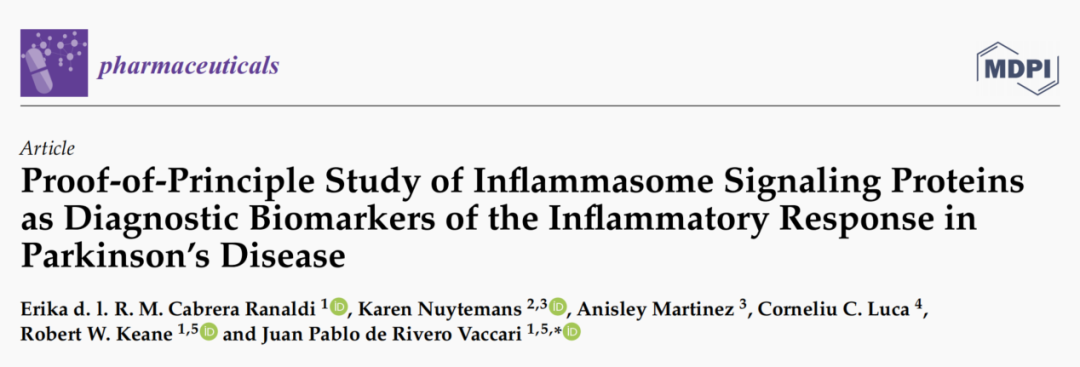 近期,美國邁阿密大學米勒醫(yī)學院在Pharmaceuticals發(fā)表了題為“Proof-of-Principle Study of Inflammasome Signaling Proteins as Diagnostic Biomarkers of the Inflammatory Response in Parkinson's Disease”的研究文章,證明炎性小體信號蛋白Caspase-1和ASC以及促炎細胞因子IL-18是帕金森病可靠的生物標志物。