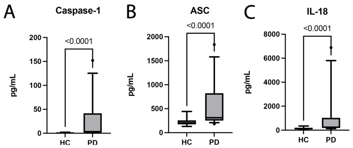 本文評估了32名PD受試者血漿中炎性小體相關蛋白和下游促炎細胞因子IL-18的水平,并與年齡匹配未受影響的對照組進行了比較。與對照組相比,PD患者的Caspase-1、ASC和IL-18蛋白水平顯著升高。