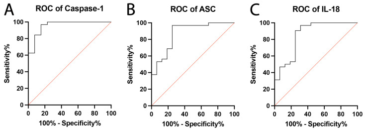 研究人員通過繪制每種蛋白質的受試者工作特征(ROC)曲線來評估它們作為PD炎癥生物標志物的可靠性。Caspase-1的AUC值為0.96,特異性為85%,敏感性為96.88%。ASC的AUC值為0.87,特異性為75%,敏感性為96.88%。炎性細胞因子IL-18的AUC值為0.85,特異性為75%,敏感性為90.63%。此外,研究人員使用逐步方法進行了多元線性回歸分析,證明了炎癥小體蛋白是帕金森病炎癥的可靠生物標志物,并且炎癥小體蛋白對帕金森病的IL-18水平有重要貢獻。