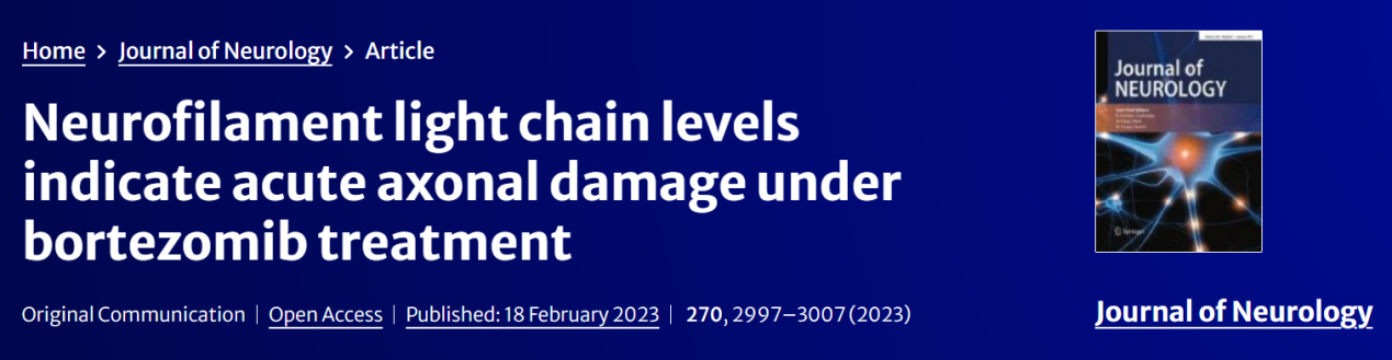 2023年2月,德國(guó)維爾茨堡大學(xué)醫(yī)學(xué)院在Journal of Neurology發(fā)表題為“Neurofilament light chain levels indicate acute axonal damage under bortezomib treatment”的研究文章,證明神經(jīng)纖維絲輕鏈(Neurofilament light chain,NfL)可以作為硼替佐米治療下急性軸突損傷的生物標(biāo)志物。
