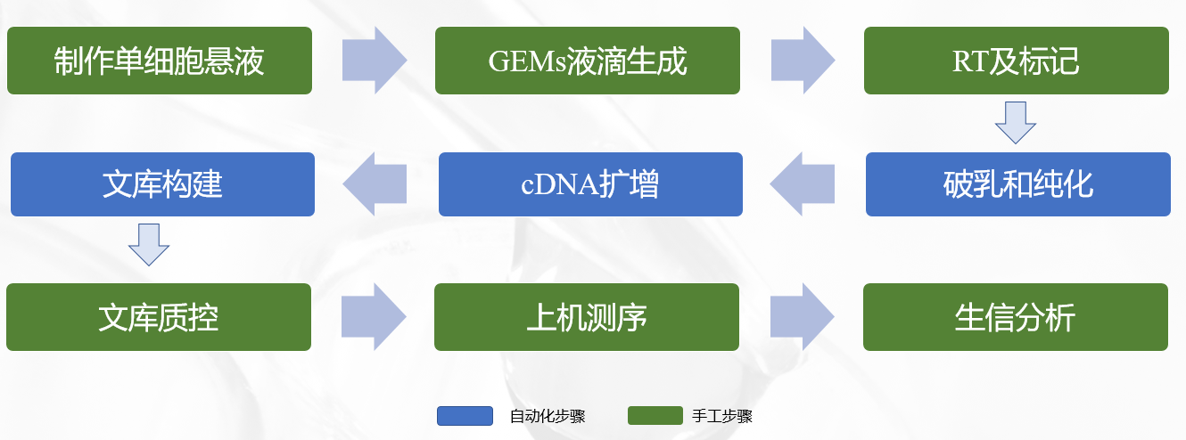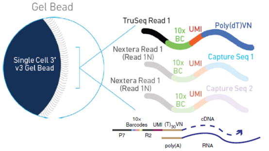 目前10X Genomics平臺是市場上最為常見的單細胞測序平臺,基于10X Genomics平臺的高通量單細胞測序技術(shù)是利用液滴法的原理,使用GemCode技術(shù),通過控制微流體的進入,將帶barcode、UMI(Unique Molecular Index,分子標簽)、引物及酶的凝膠珠(Gel Beads)與單細胞混合,從而實現(xiàn)大規(guī)模的單細胞分離,以及單細胞文庫構(gòu)建的技術(shù)。