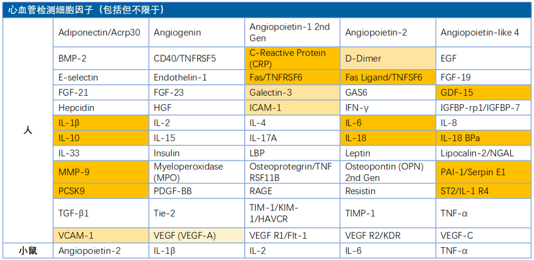 IL-1β、IL-4、IL-6、IL-8、IL-10、IL-17A、IL-18、TNF-a、ANG-2、GDF-15、E-selectin、Fas、PCSK9、ANGPTL4、Leptin、Insulin、ICAM-1、 VCAM-1、 TIMP-1、Galectin-3、Endothelin、Fas Ligand、FGF-23 Total、TIM-1