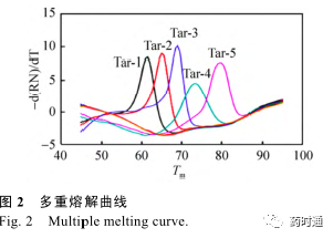 非特異性的熒光染料嵌入到 DNA 雙鏈小溝中后,在特定的激發(fā)光激發(fā)后將會產(chǎn)生一定波長的熒光。以此為基礎(chǔ)發(fā)展了熔解曲線 (Meltingcurve) 分析法,利用不同 DNA 序列具有不同 T m(Melting temperature) 值的特征,在 PCR 反應(yīng)結(jié)束后,通過程序升溫使雙鏈逐漸解鏈成單鏈,當(dāng)達(dá)到雙鏈特異的 T m 值所對應(yīng)的溫度時,熒光強(qiáng)度大幅度降低,利用這樣的原理可以對 PCR 中不同長度的雙鏈產(chǎn)物或相同長度不同 GC 含量的雙鏈進(jìn)行分析 (圖 2)。Singh 等 [13] 利用多重實時PCR 熔解曲線分析的方法,成功地實現(xiàn)了同時對氨芐西林、鏈霉素、磺胺、四環(huán)素、氯霉素耐藥的沙門氏菌的檢測與辨別,Mendes 等 [14] 建立了一種多重熔解曲線分析方法并且實現(xiàn)了對不同基因編碼的金屬-β-內(nèi)酰胺酶型別的檢測和鑒別。針對不同的型別設(shè)計了特異性的引物對,從而對模板進(jìn)行擴(kuò)增生成不同的擴(kuò)增子,擴(kuò)增子之間T m 值各有差異,最后通過熔解曲線峰的位置進(jìn)行鑒別。在熔解曲線分析技術(shù)的基礎(chǔ)上發(fā)展而來的高分辨率熔解曲線技術(shù)是一種利用飽和染料,借助高分辨率的儀器,實現(xiàn)對單個核苷酸熔解溫度不同從而形成不同形態(tài)熔解曲線,進(jìn)而對基因進(jìn)行分析的新技術(shù),它具有極高的靈敏度,能夠檢測出單個堿基之間的差別,目前主要應(yīng)用于單核苷酸多態(tài)性分析、甲基化分析、基因突變、基因分型等領(lǐng)域 [15-18] 。