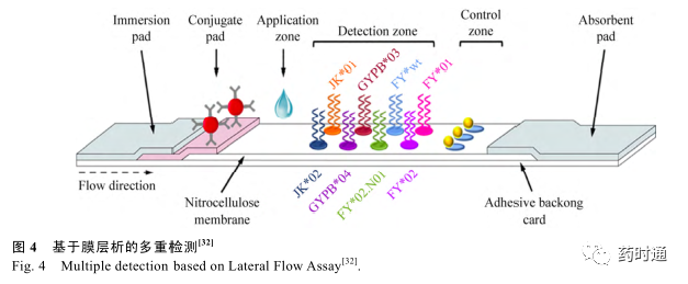 膜層析技術(shù) (Membrane chromatography) 是在柱層析技術(shù)上發(fā)展而來的一項技術(shù),以膜介質(zhì)為基質(zhì),偶聯(lián)相應(yīng)的離子交換、親和、疏水等化學(xué)基團(tuán),制作而成的一種新型的層析介質(zhì)。膜層析技術(shù)具有簡單快速并且能夠自動分離液體混合物的優(yōu)點(diǎn),而多重 PCR 技術(shù)具有有效富集目的片段的優(yōu)點(diǎn),將這兩種技術(shù)有機(jī)地結(jié)合在一起能夠形成一種靈敏度高、特異性好、成本低、簡便快速的多重核酸檢測方法。該方法提前將靶標(biāo)特異性的捕獲探針固定在層析膜的不同位置上,然后使變性后的多重PCR擴(kuò)增產(chǎn)物通過毛細(xì)作用經(jīng)過層析膜,固定在特定位置的捕獲探針通過堿基互補(bǔ)配對的作用將末端帶有膠體金或熒光素的產(chǎn)物捕獲,而非特異的擴(kuò)增產(chǎn)物及引物被洗脫,最后通過肉眼或熒光檢測儀對產(chǎn)生的熒光進(jìn)行檢測和識別 (圖 4) [32] 。Mao 等 [33] 基于膠體金標(biāo)記的核酸探針和側(cè)流試紙條建立了一種現(xiàn)場檢測目的基因的方法,利用這種核酸層析金標(biāo)試紙條能夠在 15 min內(nèi)檢測出核酸樣本。Carter 等 [34] 發(fā)明的側(cè)流微陣列方法能夠快速、靈敏地對多種核酸進(jìn)行檢測,并且不需要專門的儀器設(shè)備,這種方法以微型側(cè)流設(shè)備為基礎(chǔ),利用核酸雜交介導(dǎo)靶標(biāo)的捕獲。Gomez-Martinez等 [32] 開發(fā)的多重核酸檢測試紙條在現(xiàn)場實現(xiàn)了對 108 例獻(xiàn)血者血型相關(guān)基因型的準(zhǔn)確鑒定。基于膜層析的多重檢測技術(shù)以其操作簡單、攜帶便捷等優(yōu)點(diǎn)拓寬了可檢測的范圍,使檢測不再局限于實驗室,對于現(xiàn)場檢測也能夠?qū)?/span>現(xiàn) [35-37] ,但是膜層析技術(shù)中樣品的阻滯、非特異性雜交等問題仍然是今后需要解決的問題。