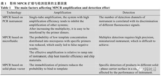 MPCR 技術(shù)的優(yōu)勢在于它的高效性,通過一次擴(kuò)增反應(yīng)即可實現(xiàn)對多種病原體進(jìn)行檢測和鑒別,相較多個單重檢測而言成本顯著降低。MPCR 有著廣泛的應(yīng)用前景,但是仍然存在許多影響 MPCR 擴(kuò)增與檢測效果的因素 (表 1),其中擴(kuò)增效率的一致性是最大的難題,檢測重數(shù)越多,效率一致性往往越低。針對 MPCR 擴(kuò)增效率一致性的問題,傳統(tǒng)單管多靶標(biāo)擴(kuò)增的方式通過不斷優(yōu)化反應(yīng)體系中緩沖液、酶、引物、探針等的用量,確保每一重的擴(kuò)增效率保持一致,然而隨著檢測重數(shù)的增加,形成二聚體甚至多聚體的可能性也大幅上升,輕則導(dǎo)致非特異性擴(kuò)增的出現(xiàn),靶標(biāo)擴(kuò)增效率下降,檢測靈敏度和特異性降低,重則導(dǎo)致非特異性擴(kuò)增占據(jù)主導(dǎo),靶標(biāo)擴(kuò)增失敗,造成假陽性和/或假陰性,影響檢測準(zhǔn)確性。而基于微流控的 MPCR 則將每一重的擴(kuò)增分布在各自相對獨(dú)立的空間內(nèi)進(jìn)行,在一定程度上降低了引物二聚體的生成,保證了擴(kuò)增效率,但是微流控的實現(xiàn)相對較為困難,且當(dāng)模板濃度較低時,易產(chǎn)生假陰性結(jié)果。相比于上述方法,基于固相載體表面擴(kuò)增的 MPCR 則將不同的引物對分配至不同的固相載體上,使得每個靶標(biāo)的擴(kuò)增集中于以特定固相顆粒為載體的表面,從根本上解決 MPCR 引物間相互干擾的問題,此外將固相載體表面擴(kuò)增與 Luminex 液相芯片檢測技術(shù)相結(jié)合能夠同時對各固相顆粒及顆粒表面的擴(kuò)增信號進(jìn)行特異性識別,并且理論上能夠?qū)崿F(xiàn)100 重的核酸擴(kuò)增與檢測,極大地提高了檢測重數(shù)的同時又能保證各靶標(biāo)的擴(kuò)增互不干擾,但是由于需要將引物束縛至固相載體,這在一定程度上限制了引物與模板的碰撞概率并且導(dǎo)致其擴(kuò)增效率降低,那么如何提高固相載體表面的擴(kuò)增效率值得深入思考。針對上述問題,可通過將反應(yīng)體系分隔成微小液滴,或結(jié)合管式對流 PCR技術(shù)使反應(yīng)體系在擴(kuò)增的過程中循環(huán)流動,將有望提高引物與模板之間碰撞的概率,同時提高固相載體表面的擴(kuò)增效率,從而開發(fā)出擴(kuò)增效率高、一致性好、體系穩(wěn)定、檢測重數(shù)高的多重PCR 技術(shù)。