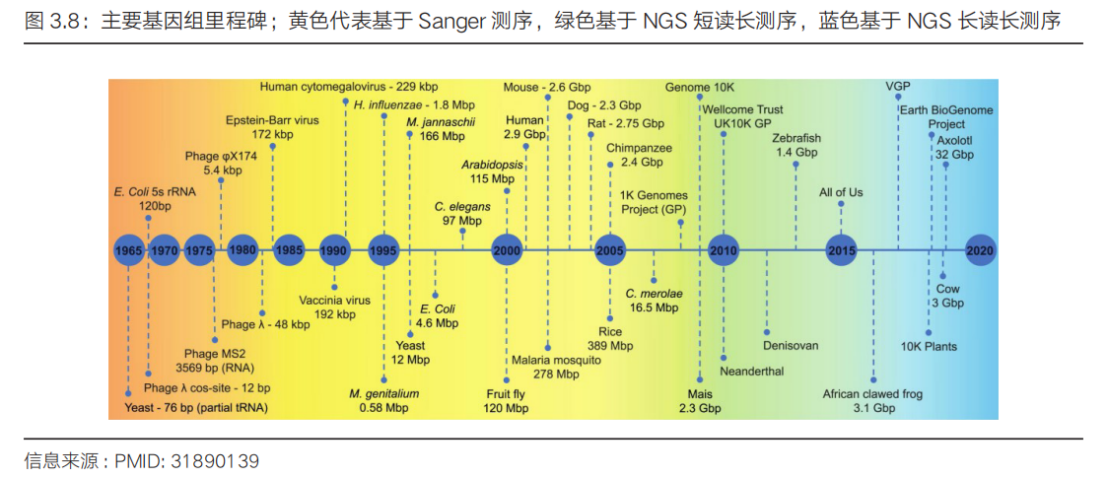 NGS 在納米級(jí)空間內(nèi)進(jìn)行 PCR 反應(yīng)來(lái)擴(kuò)增 DNA(ONT 等不需用到 PCR),基于大規(guī)模平行的反應(yīng)產(chǎn)生巨大數(shù)據(jù)量。單位反應(yīng)產(chǎn)生的數(shù)據(jù)量逐年提高,成本超摩爾定律下降,目前全基因組測(cè)序(30x)成本低于 500 美元。極大推動(dòng)了人口級(jí)大規(guī)?;驕y(cè)序基礎(chǔ)研究,對(duì)于將基因技術(shù)應(yīng)用到臨床輔助診斷及伴隨診斷、新藥研發(fā)、病原溯源等作出了重要貢獻(xiàn)。